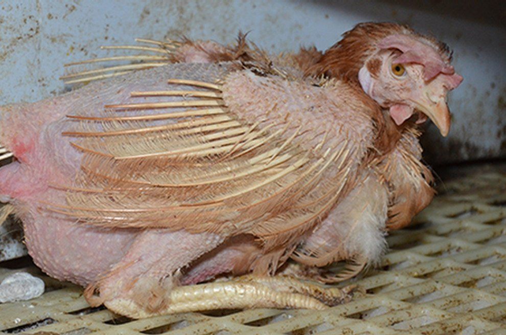 اکثر این مرغها به بیماری مبتلا هستند و کرک و پر همه آنها ریخته است. بدیهی است، زندگی در این شرایط، مغایر با وضعیتی می باشد که طبیعت برای این حیوان در نظر گرفته است. س