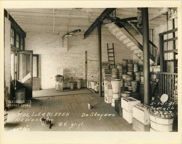 L: External view under building overhang of storefronts with signage for Losio Brothers and Wholesale B. Dorman Groceries and two men in the distance, 4/15/1941. National Archives Identifier 164911818