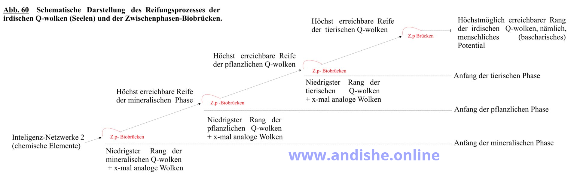 ein allmählicher, ununterbrochener, stufiger, aufsteigender Vorgang ist, der in vier Wendepunkten jedes Mal aus dem höchsten Stand einer Phase zum niedrigsten Stand einer höheren Phase fortläuft, bis das Ziel, nämlich die menschliche Quantenwolke, erreicht ist.