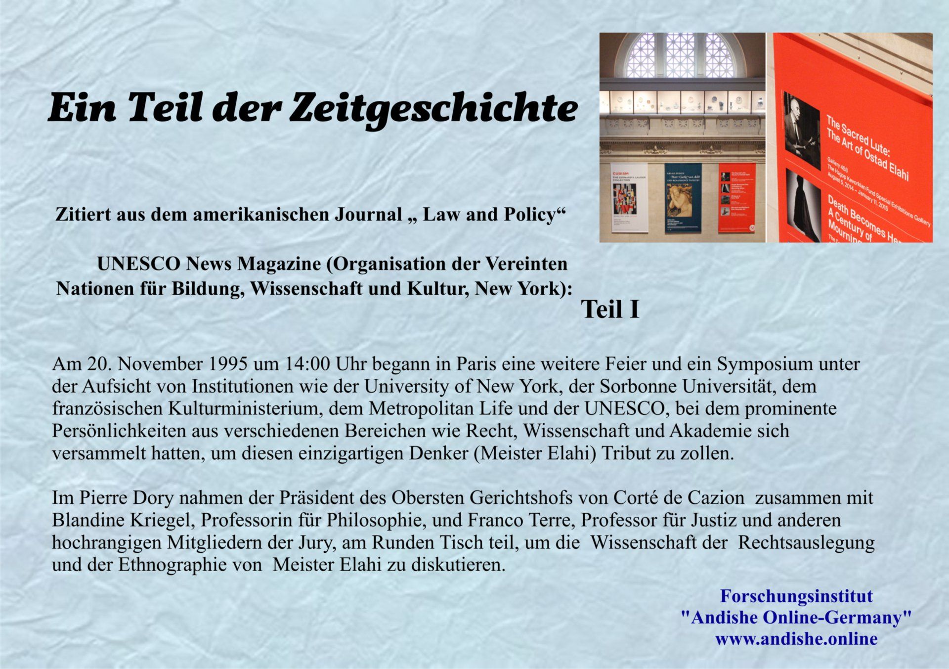 Jean During¹², Professor für Ethnomusikologie und Orientwissenschaften, verfasste ein Buch über Ostad Elahis einzigartigen Musikstil unter dem Titel „L’Âme des sons: L’art unique d’Ostad Elahi.“¹³