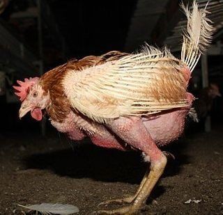 Most of these chickens are infected, which causes their feathers to fall off. Living in these conditions is clearly contrary to their natural requirements for these animals.