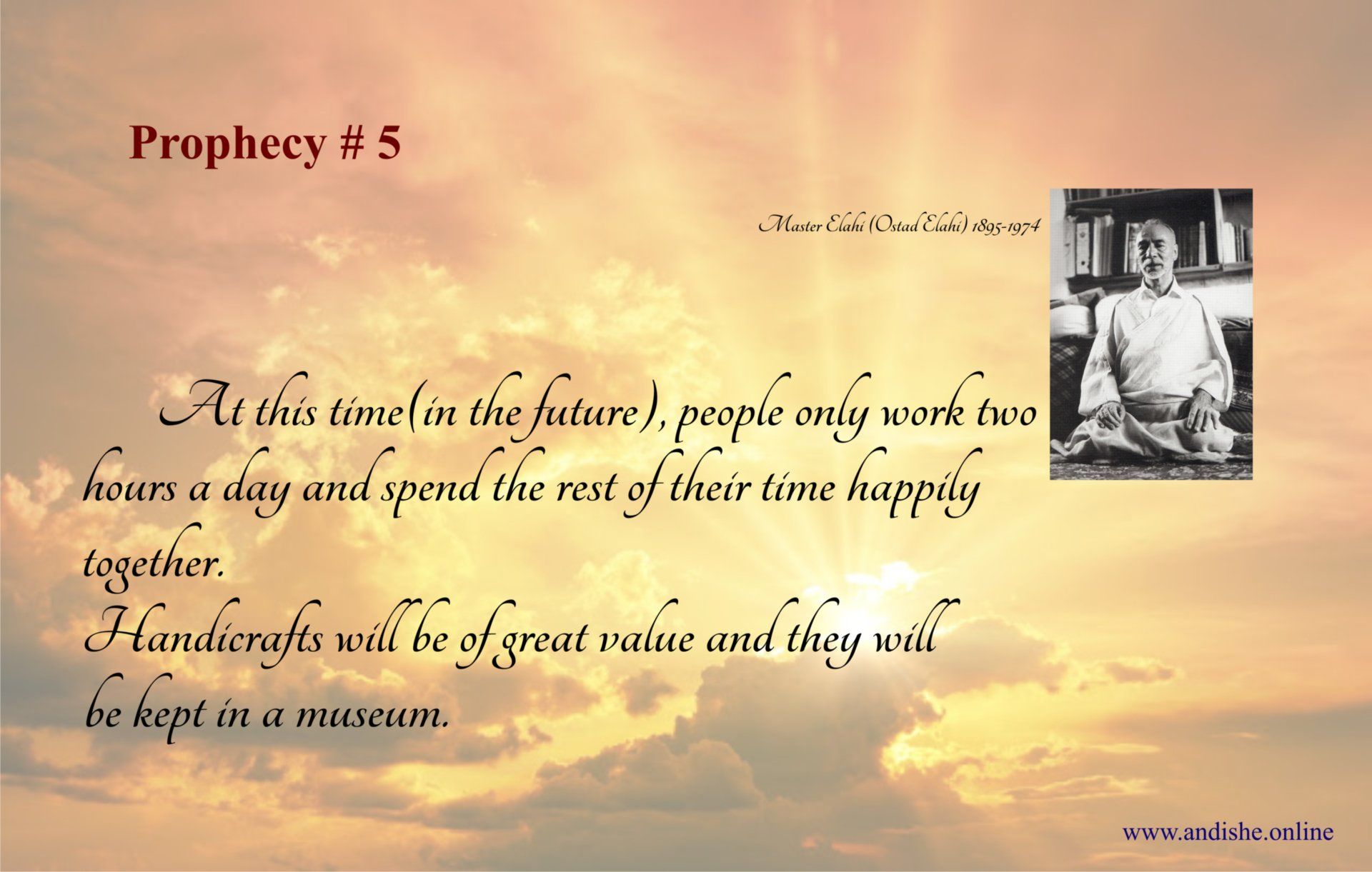 Ostad Elahi predicts a future for humanity that is free of unemployment, poverty, and class differences. People will have more time to enjoy life together while machines do all the work. For this reason, probably no one will spend time doing handicrafts. Consequently, true handicrafts will become rare. Consequently, works of art will need to be kept in museums.
