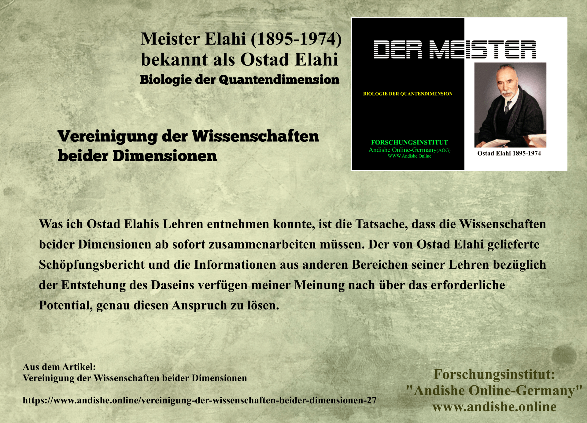 Was ich Ostad Elahis Lehren entnehmen konnte, ist die Tatsache, dass die Wissenschaften beider Dimensionen ab sofort zusammenarbeiten müssen. Der von Ostad Elahi